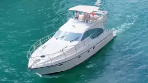 Our Xclusive 9 52ft Luxury Mid-Sized Yacht is set over 2 decks with a comfortable and well thought through Fly Bridge design and large saloon area. Comparable to our Xclusive 10 in space, the X9 is a comfortable match for groups of 8 to be together in any one area of the vessel, but will accommodate up to 17 spread across the yacht. She is equipped with a cushioned bow sunbathing area, BBQ and swimming ladder to heighten the charter experience.