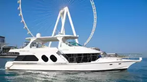 Experience the finest Bluewater Serene Yacht. The 62ft yacht embodies the essence of luxury yacht rental with spacious suites, grand flybridge, and a stunning saloon. This private yacht features an incredible wet sound entertainment system onboard for those looking to celebrate an occasion or relax in style.